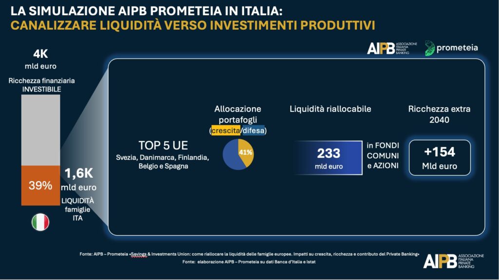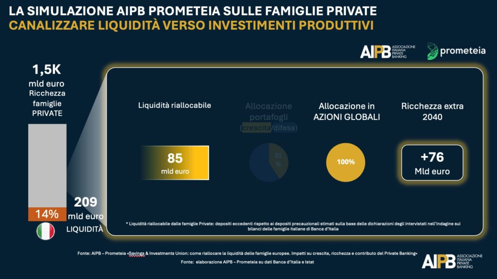 Applicando la medesima metodologia all’Italia, Aipb e Prometeia hanno stimato una riallocazione di 233 miliardi di euro di liquidità che potrebbe generare entro il 2040 un incremento di 154 miliardi di euro di ricchezza, con effetti positivi su PIL, consumi, investimenti, entrate fiscali e riduzione del rapporto debito/PIL.