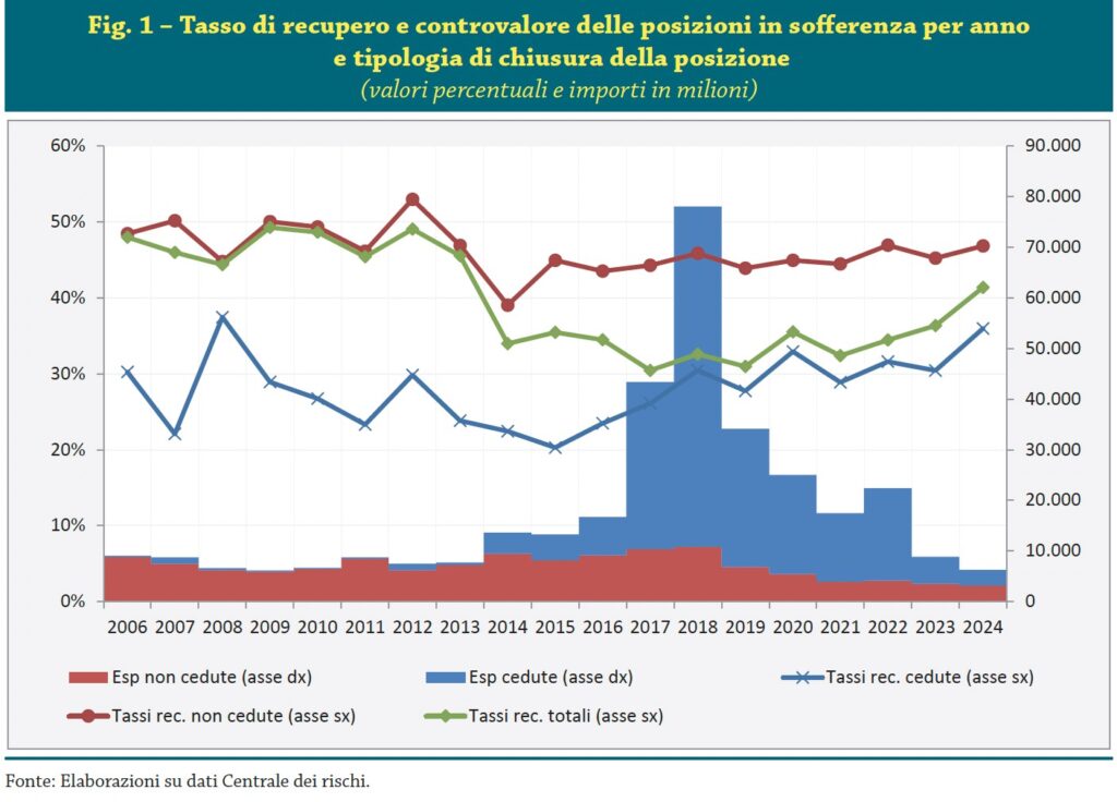 Rispetto al 2023, il tasso di recupero medio delle sofferenze bancarie è aumentato di cinque punti percentuali, al 41%, di cui tre riconducibili alle chiusure di posizioni assistite da garanzie pubbliche e caratterizzate da tassi di recupero particolarmente elevati.