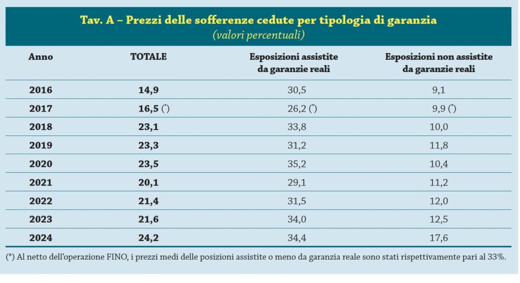 Il prezzo delle sofferenze cedute nel 2024 è stato pari in media al 24% dell’esposizione lorda di bilancio al momento della cessione, in aumento di due punti percentuali rispetto al 2023.