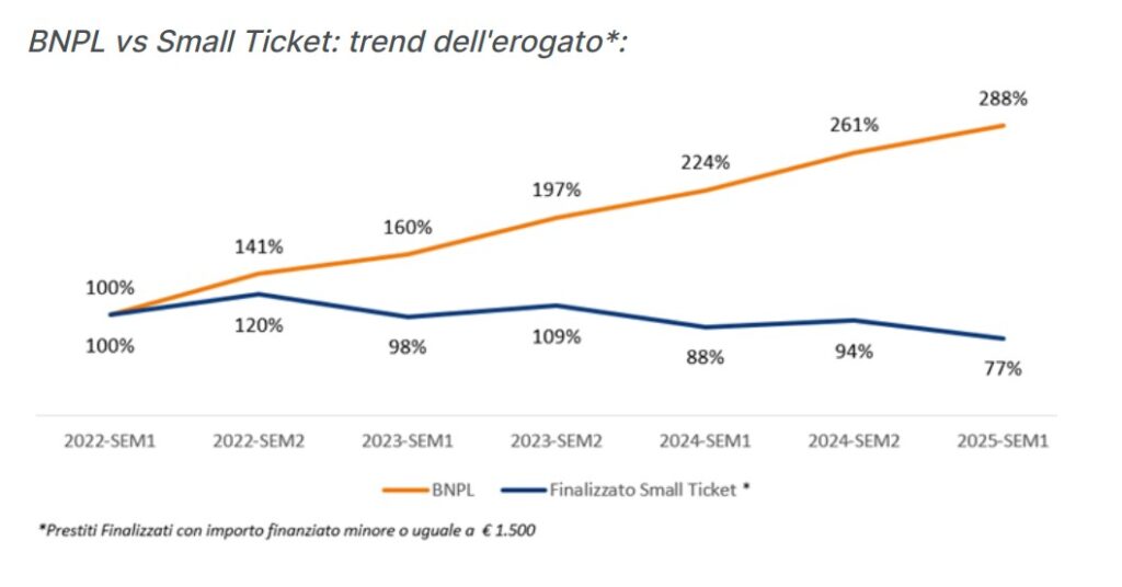 Il Buy Now Pay Later (BNPL) continua a correre e si consolida come uno dei motori più dinamici del credito al consumo in Italia. Tra il primo semestre del 2022 e lo stesso periodo del 2025, i finanziamenti BNPL sono cresciuti del +188%, un incremento che testimonia l’adozione sempre più diffusa di questa formula di pagamento digitale. Il trend positivo prosegue anche nel primo semestre del 2025, con un ulteriore +28% rispetto al 2024, mentre il segmento del prestito finalizzato Small Ticket registra un calo del 13%, segno di un cambiamento nelle preferenze dei consumatori, oggi orientati verso soluzioni più agili e flessibili. Sono alcune delle principali evidenze del Market Outlook relativo al BNPL realizzato da CRIF.