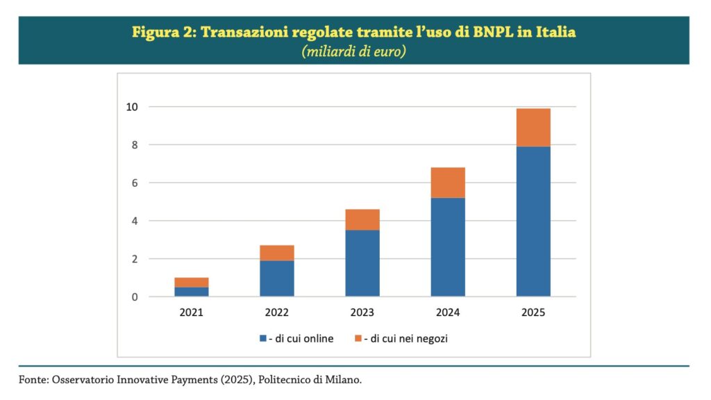 Nel contesto nazionale, le operazioni BNPL sono passate da 1 miliardo di euro nel 2021 a 9,9 miliardi nel 2025, secondo l’Osservatorio Innovative Payments del Politecnico di Milano, mentre la quota di famiglie utilizzatrici è salita dal 4% nel 2022 al 30% nel 2025, pur con un utilizzo prevalentemente occasionale. Le evidenze internazionali indicano un utilizzo più diffuso tra soggetti con fragilità finanziaria, come rilevato negli Stati Uniti e nel Regno Unito dalla Financial Conduct Authority, dove gli utenti presentano una probabilità più elevata di incorrere in difficoltà economiche.