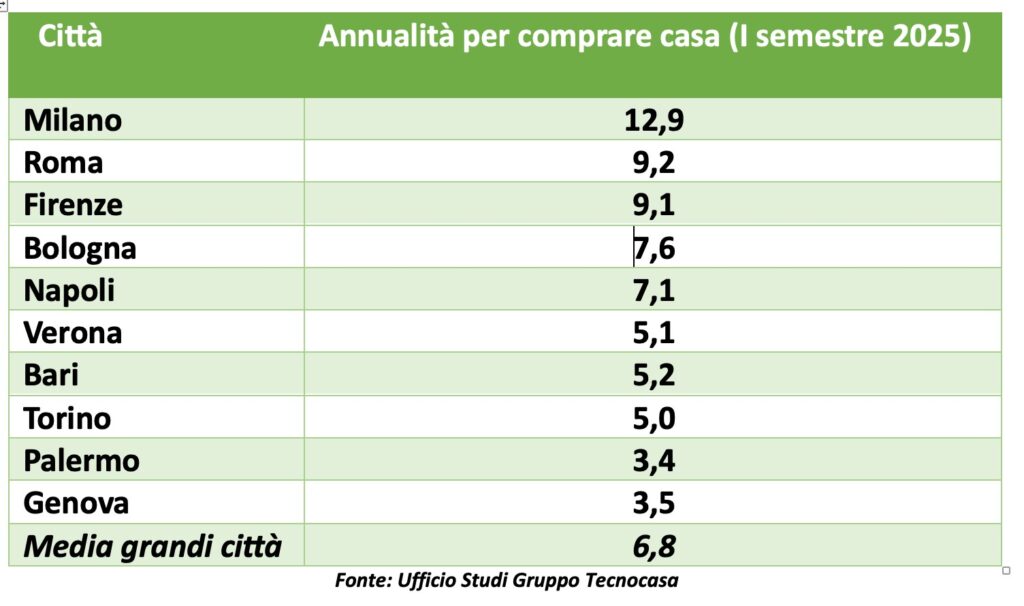 Acquistare una casa nelle grandi città italiane richiede in media 6,8 annualità di stipendio, secondo i dati dell’Ufficio Studi del Gruppo Tecnocasa relativi al primo semestre del 2025.