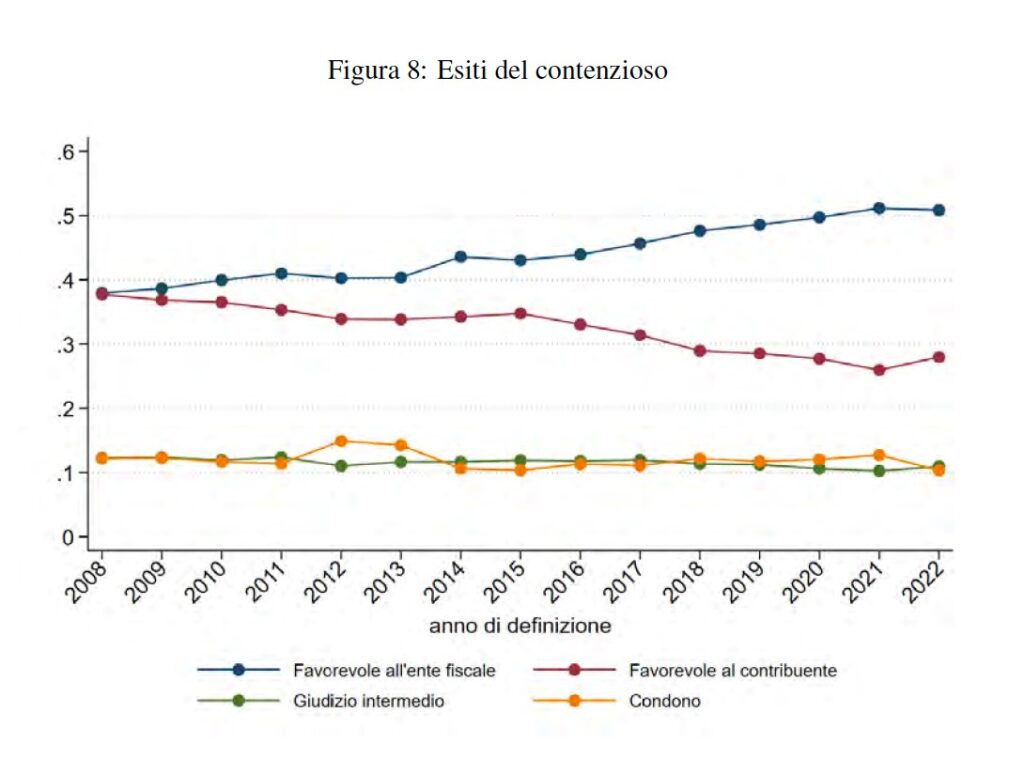Nel corso degli anni si è osservato, a partire dal 2008, un aumento della quota dei contenziosi conclusa a favore degli enti fiscali. Sono comunque numerosi (oltre il 30%) i casi in cui i giudizi sono stati ribaltati tra il primo e il secondo grado di giudizio.
