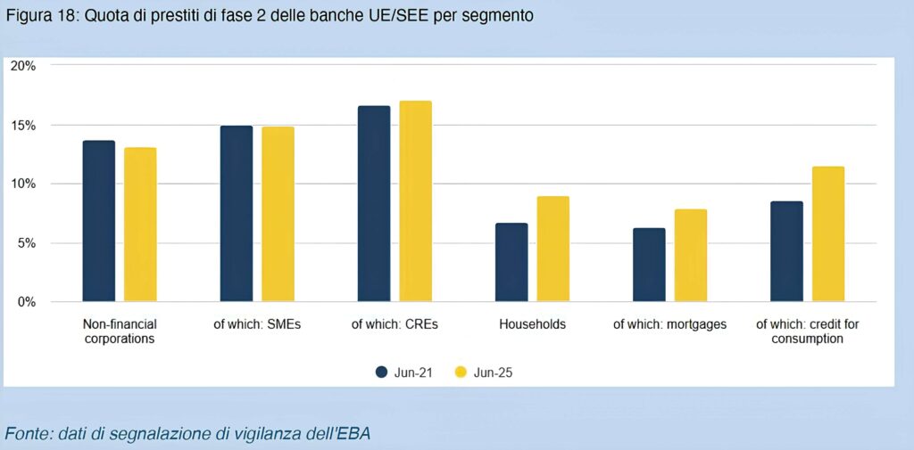 Il dato che impensierisce di più nel report del regolatore europeo riguarda comunque i crediti in cosiddetta “fase due” (stage 2). Sono quei prestiti che, pur essendo ancora performing, hanno subito un incremento significativo del rischio di credito rispetto alla concessione iniziale, segnalando un peggioramento delle condizioni finanziarie del debitore, ciò che richiede maggiore attenzione e accantonamenti da parte della banca. Ebbene, i crediti in stage 2 hanno raggiunto un ammontare di 1.600 miliardi di euro, 100 miliardi in più rispetto a un anno fa. È un segmento che vale circa il 9,7% dell’intero ammontare dei crediti bancari e cresce soprattutto nei comparti del credito al consumo e nei mutui ipotecari.