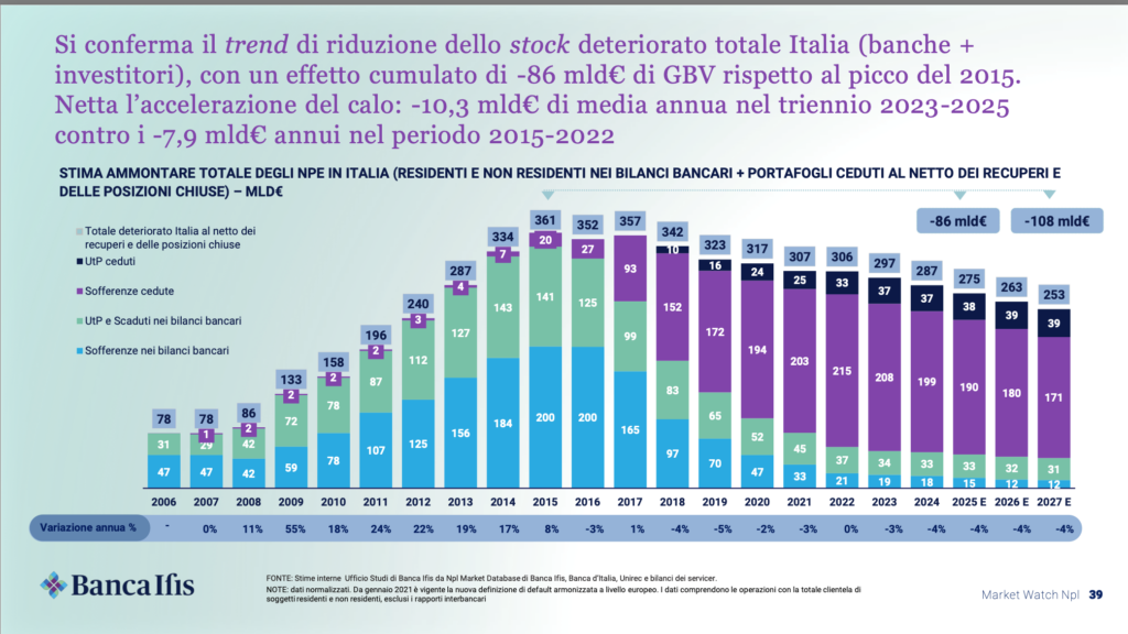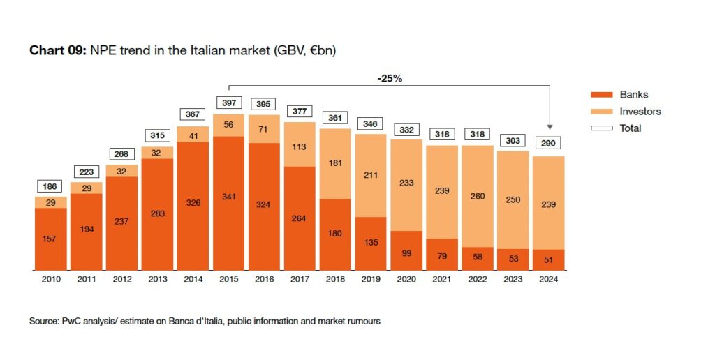 Se questi sono i dati, vanno interpretati. A fronte di un flusso di deteriorati che appare modesto ma mantiene nel tempo una sua persistenza, lo stock è viceversa diminuito assai rapidamente ed in modo molto consistente. Che fine hanno fatto quei crediti spariti dai bilanci bancari? Sono evaporati? Nient’affatto. Come sappiamo, sono stati trasferiti, attraverso cartolarizzazioni, nelle mani di altri investitori che ora stanno cercando di recuperarli attraverso operatori specializzati (i credit servicer). Ci aiutano a capire il trend i due principali report sull’industria italiana dei crediti distressed, quelli pubblicati annualmente (subito dopo l’estate) da PWC e Banca Ifis.