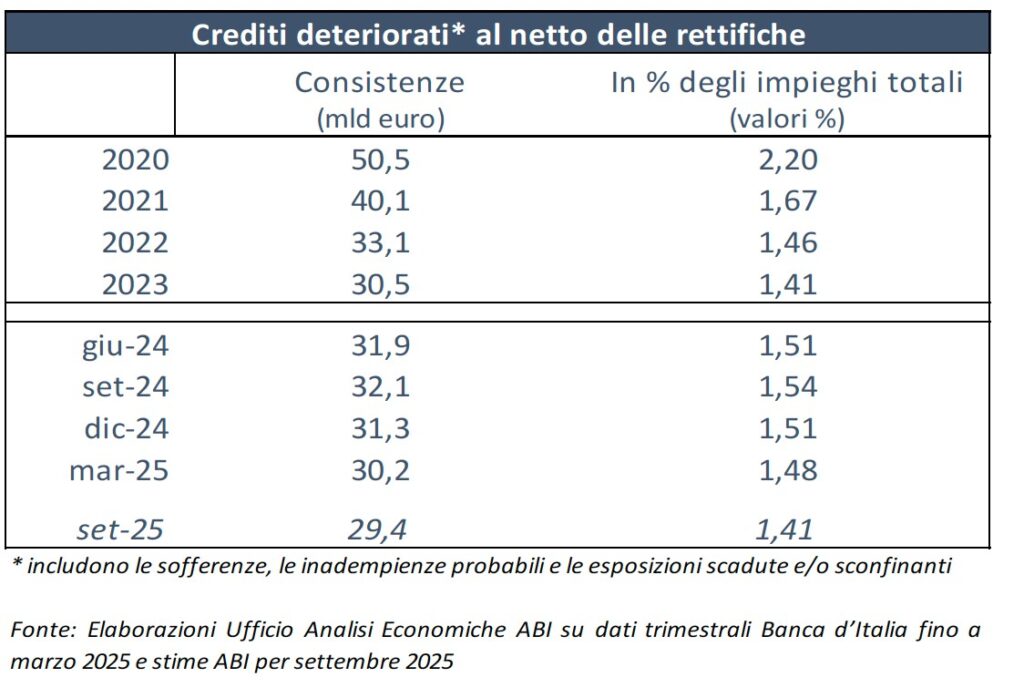 A settembre 2025 i crediti deteriorati netti delle banche italiane sono rimasti sostanzialmente stabili rispetto al mese precedente (29,4 miliardi di euro), ma in diminuzione rispetto ai 30,2 miliardi di marzo 2025 (31,3 miliardi a dicembre 2024). È quanto risulta dal consueto report mensile dell’Abi, secondo cui nello stesso mese i crediti deteriorati netti rappresentavano l’1,41% dei crediti totali.