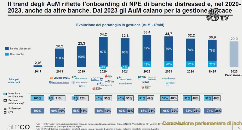 Nel corso dell’incontro con i parlamentari, Munari ha riepilogato i primi risultati della nuova strategia del gruppo, da quando, nel 2023, ne ha assunto la guida. Amco gestisce uno stock di crediti che a giugno 2025 era pari a 31 miliardi, non acquisisce nuovi portafogli da metà 2023 e punta a chiudere il 2026 con 25,5-26 miliardi.
