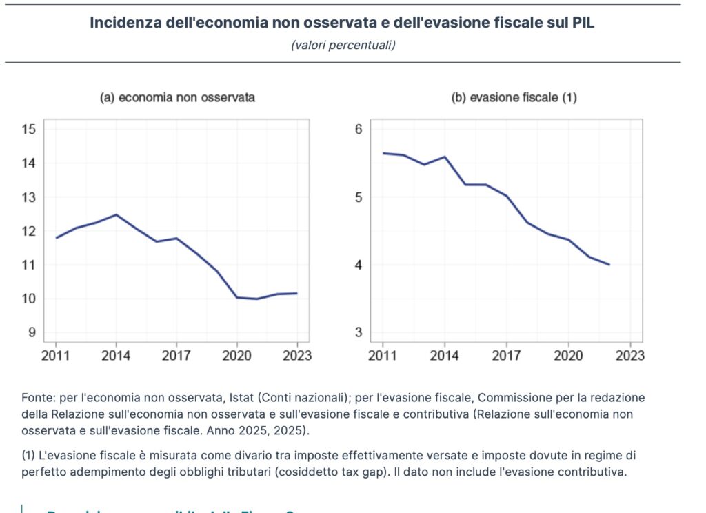 L’ammontare di queste attività nel 2023 è stato quantificato in 218 miliardi, pari al 10% del Pil. Il fenomeno penalizza l’occupazione e alimenta condizioni di lavoro degradanti, ma negli ultimi anni qualcosa è migliorato: l’incidenza del sommerso è scesa, i lavoratori irregolari sono diminuiti e l’evasione fiscale si è ridotta di quasi un terzo.