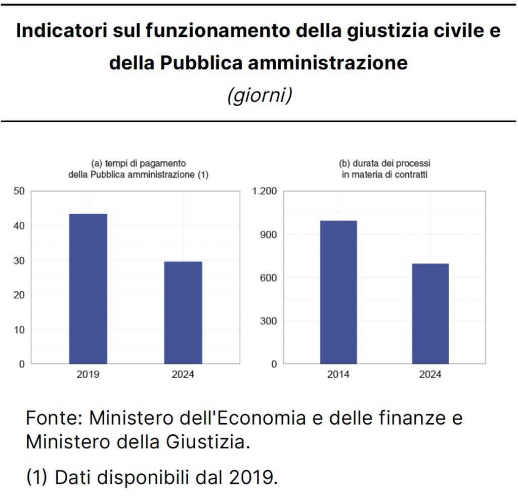 Anche la giustizia civile mostra progressi: le cause pendenti da oltre tre anni sono scese a poco più di 200.000, da 600.000 di dieci anni fa, e la durata dei processi relativi a contratti – cruciale per l’attività d’impresa – si è ridotta di quasi un terzo.