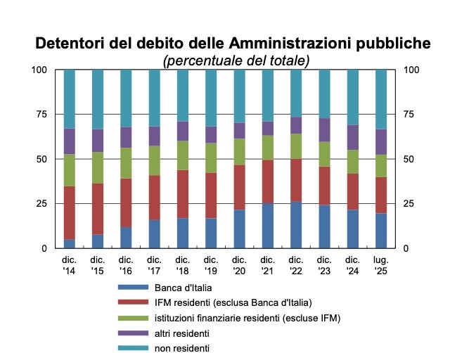 Sempre a luglio, la quota detenuta dai non residenti diminuisce lievemente al 33,3%, mentre aumenta quella dei residenti, principalmente per il sotto-comparto delle famiglie e imprese non finanziarie, al 14,3%.Nel complesso, i residenti detengono circa i due terzi del debito italiano (per 1.987 miliardi al luglio 2025), mentre i non residenti hanno la quota rimanente (per 1.010 miliardi).