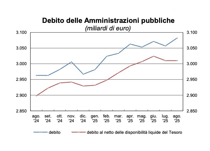 Ad agosto 2025 il debito delle Amministrazioni pubbliche italiane è cresciuto di 25,4 miliardi rispetto al mese precedente, raggiungendo quota 3.082,2 miliardi di euro, secondo i dati diffusi dalla Banca d’Italia nella pubblicazione statistica «Finanza pubblica: fabbisogno e debito», e riportati da Italpress.
