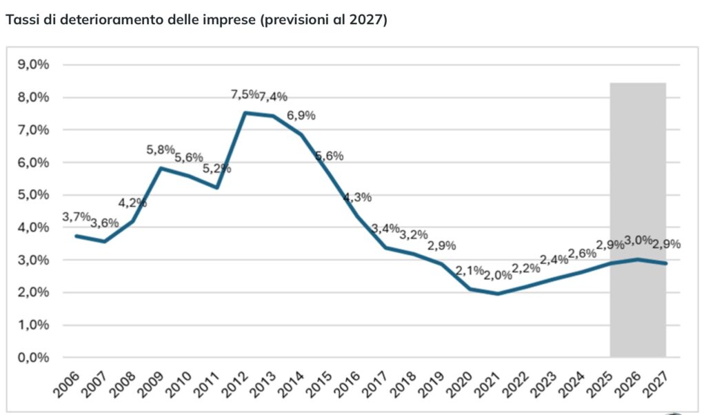 Dopo un tasso di default del 2,6% registrato nel 2024, il 2025 vedrà un aumento al 2,9%, con un picco previsto del 3% nel 2026, per tornare al 2,9% nel 2027: valori che restano comunque lontani dai livelli di crisi passate, come il picco del 7,5% del 2012.