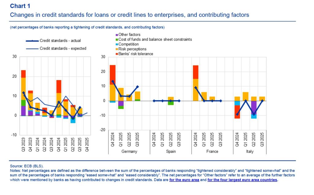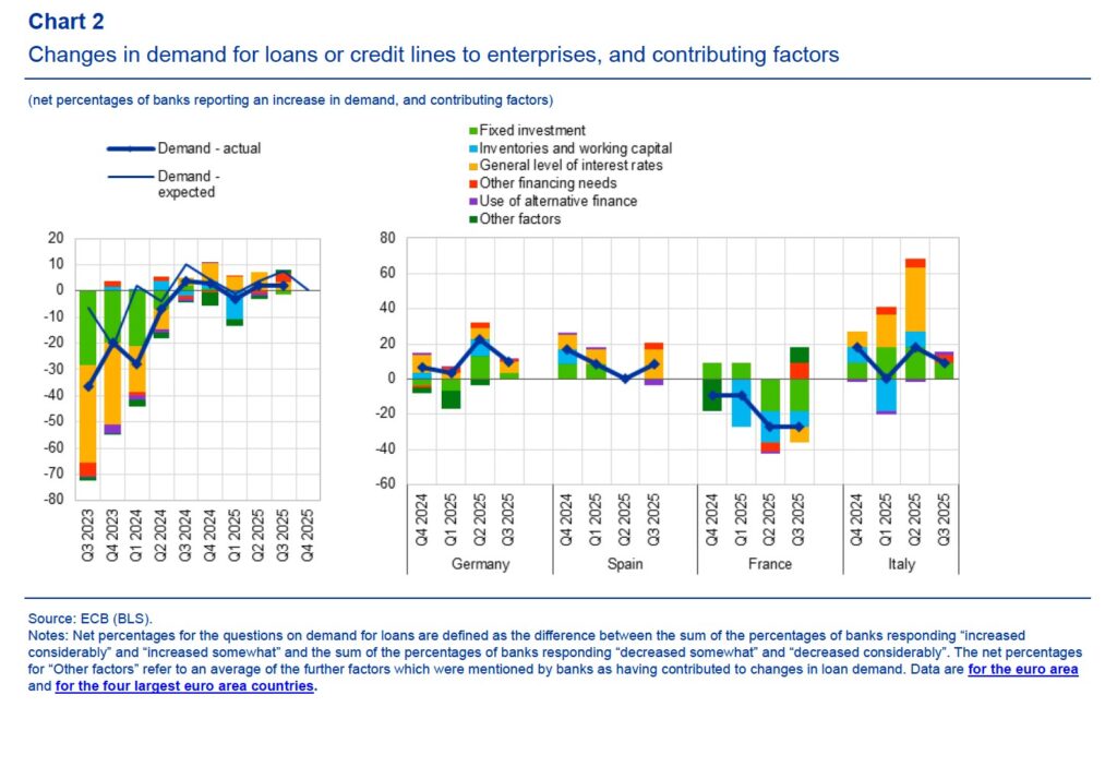 Alcune banche segnalano che le incertezze globali e le tensioni commerciali continuano a frenare le decisioni di investimento, con molte aziende che adottano un atteggiamento attendista. In Germania, Spagna e Italia la domanda di credito aziendale è in aumento, mentre in Francia si registra un calo netto.