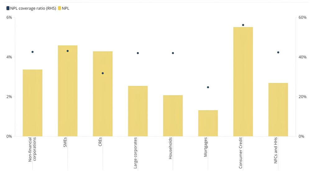 Più in dettaglio, i volumi dei crediti deteriorati (NPL) sono rimasti sostanzialmente stabili a 373 miliardi di euro, con un NPL ratio all’1,8%. Il credito al consumo e le PMI hanno continuato a registrare i rapporti NPL più elevati (vedi figura). I prestiti in Stage 2 hanno continuato a diminuire lentamente, attestandosi al 9,3%.