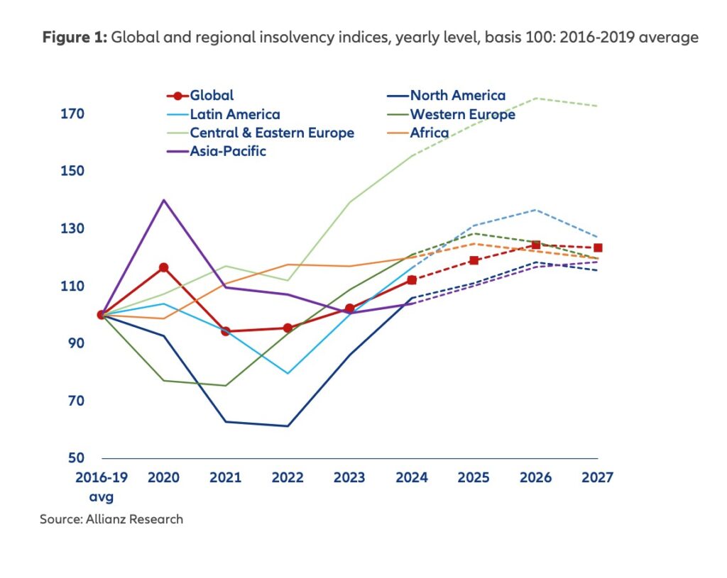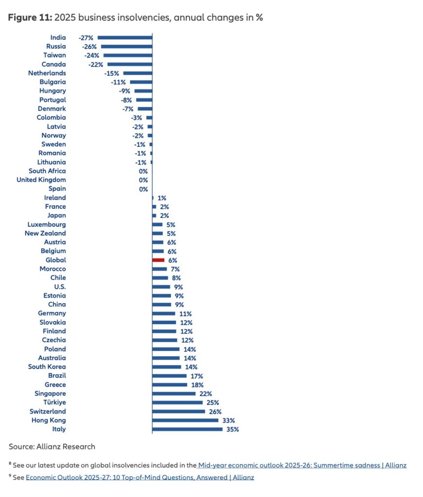 Nel report di Allianz, l’Italia è il Paese in cui le insolvenze stanno crescendo di più. A livello globale, le insolvenze sono previste in aumento del 6% nel 2025 e del 5% nel 2026, con un picco negli effetti dei dazi che potrebbe manifestarsi con ritardo, soprattutto per le economie più dipendenti dalle esportazioni.