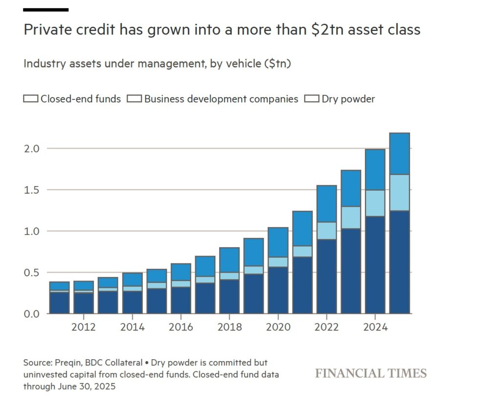 E veniamo alle ultime analisi che grandi testate economiche internazionali, Financial Times, Wall Street Journal ed Economist, hanno dedicato alla crisi del private credit. Memori della lezione del 2008, quando si scoprì che la crisi dei mutui subprime coinvolgeva gran parte del sistema finanziario internazionale, i commentatori anche in questa circostanza stanno analizzando le possibili interconnessioni tra il mondo del private credit e i settori limitrofi della finanza (banche tradizionali, assicurazioni, fondi comuni aperti), alla ricerca di collegamenti che possano innescare un effetto domino.