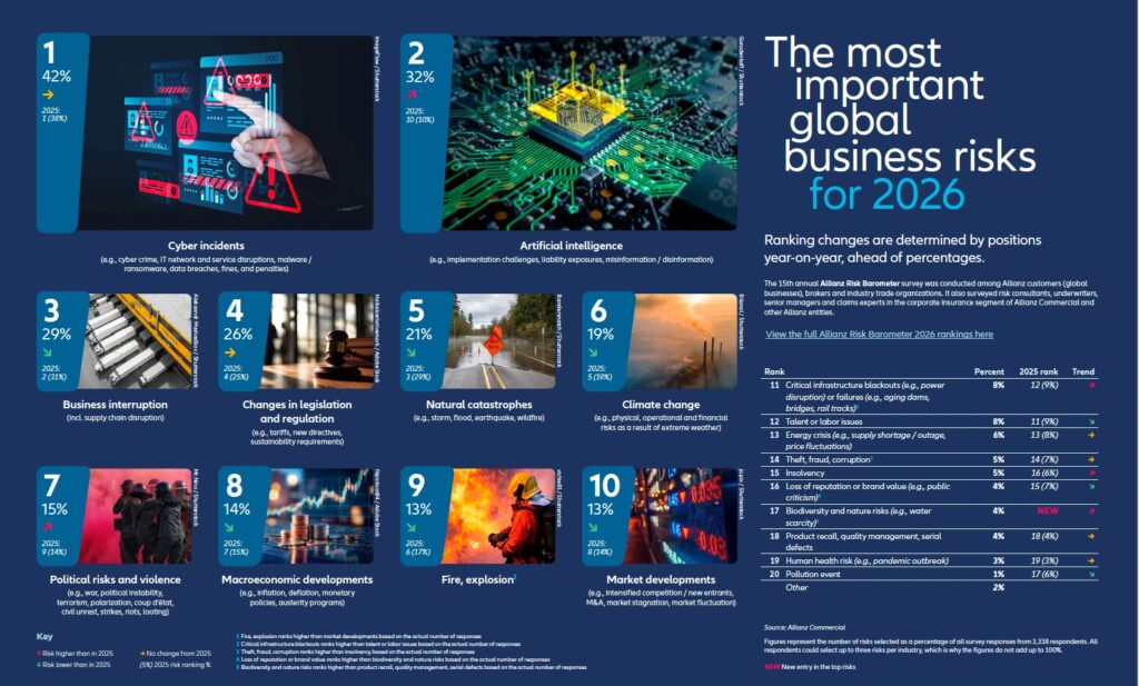 L’insolvenza non è ai primi posti tra i pericoli percepiti dalle imprese, ma è un rischio in continua crescita. Lo segnala l’ultima edizione del «Risk Barometer» di Allianz, che annualmente classifica l’andamento dei rischi aziendali. Il report – frutto, quest’anno, di interviste a 3.338 tra aziende, broker e organizzazioni di categoria di 97 Paesi – considera gli incidenti informatici il rischio che maggiormente preoccupa le imprese a livello globale, seguiti dalle incertezze relative all’Intelligenza artificiale e all’interruzione dell’attività.