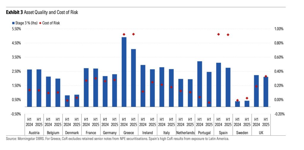 Dopo anni di calo, gli analisti ritengono che il costo del rischio (il rapporto tra gli accantonamenti per perdite su crediti e gli attivi ponderati per il rischio) abbia raggiunto nel 2025 il punto più basso e che nel 2026 si assisterà a un moderato aumento. Ad eccezione della Germania – dove l’esposizione al settore immobiliare commerciale e ai settori automobilistico ed energetico ha già portato a un deterioramento della qualità degli asset – la qualità degli asset delle banche europee è generalmente rimasta resiliente o addirittura migliorata.