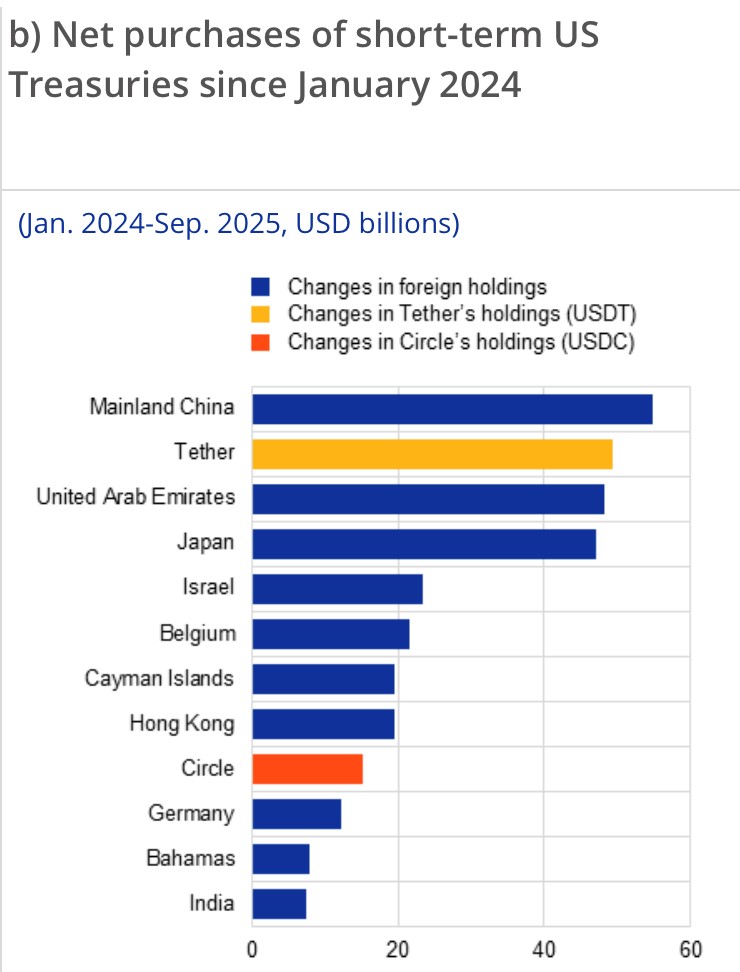 Il dominio assoluto delle stablecoin ancorate al dollaro è il primo elemento che salta agli occhi: Tether (USDT) e USD Coin (USDC) insieme valgono quasi il 90% dell’intero mercato e custodiscono riserve impressionanti, composte in larga parte da titoli del Tesoro statunitensi. Le loro dimensioni sono ormai paragonabili a quelle dei maggiori money market fund del mondo e, secondo i dati più aggiornati, negli ultimi mesi sono diventati tra i principali acquirenti netti di T-bill americani.
