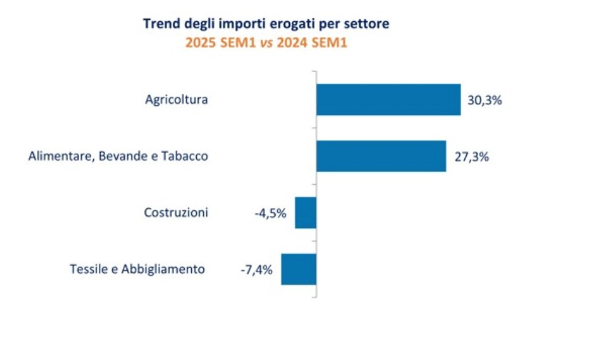 In forte crescita invece agricoltura (+30,3%) e alimentare-bevande-tabacco (+27,3%), trainati da finanza agevolata e da una maggiore domanda estera, soprattutto nei primi mesi dell’anno, quando le aspettative dei dazi USA hanno favorito un aumento delle esportazioni del made in Italy.