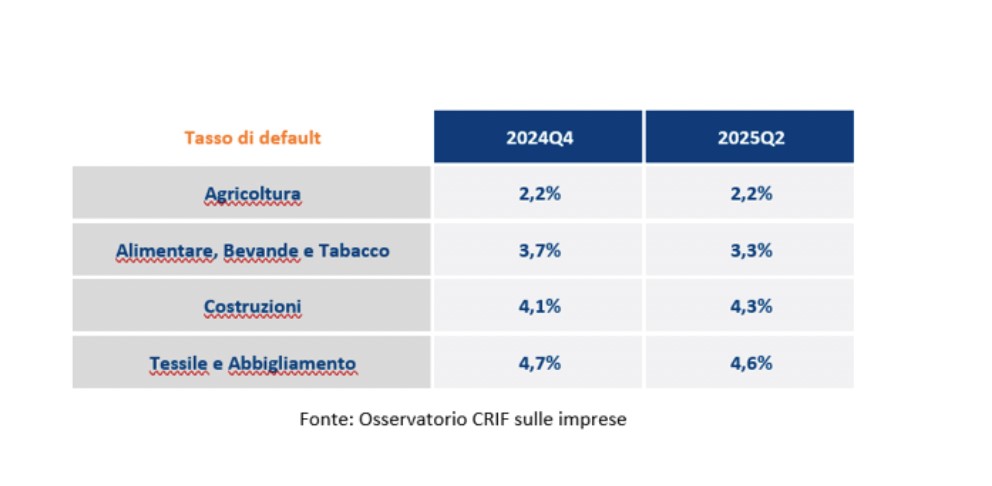 Tessile-abbigliamento (-7,4% di erogazioni, default al 4,6%) e costruzioni (-4,5%, default 4,3%) restano tra i comparti più in difficoltà, penalizzati rispettivamente dalla crisi dei consumi e dal venir meno dei bonus edilizi.