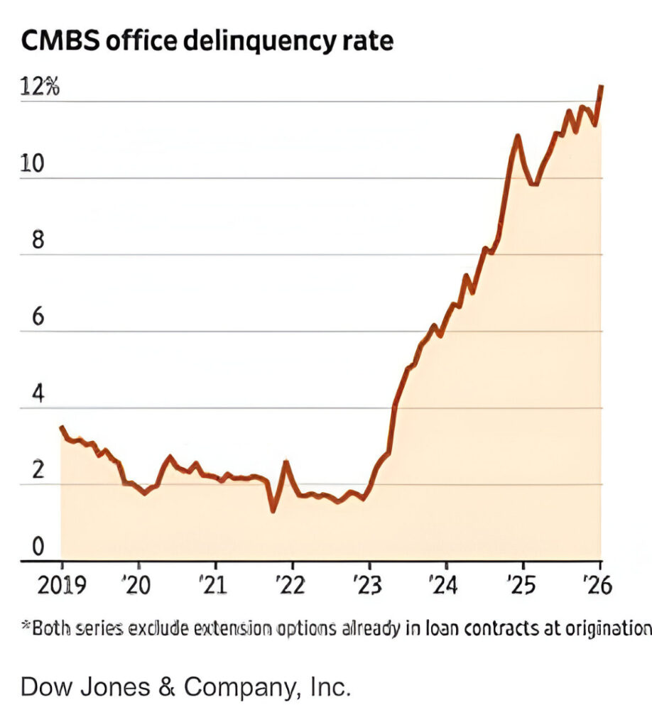 Secondo un rapporto di gennaio di Morningstar, più della metà dei circa 100 miliardi di dollari di prestiti immobiliari commerciali, impacchettati in titoli e in scadenza quest’anno – i Commercial Mortgage-Backed Securities (CMBS) – difficilmente verrà rimborsata alla scadenza. Questo dato si confronta con un tasso di rimborso a scadenza di circa il 75% nel 2024 e nel 2025 e di oltre l’80% nel 2023, ha affermato la società di rating.